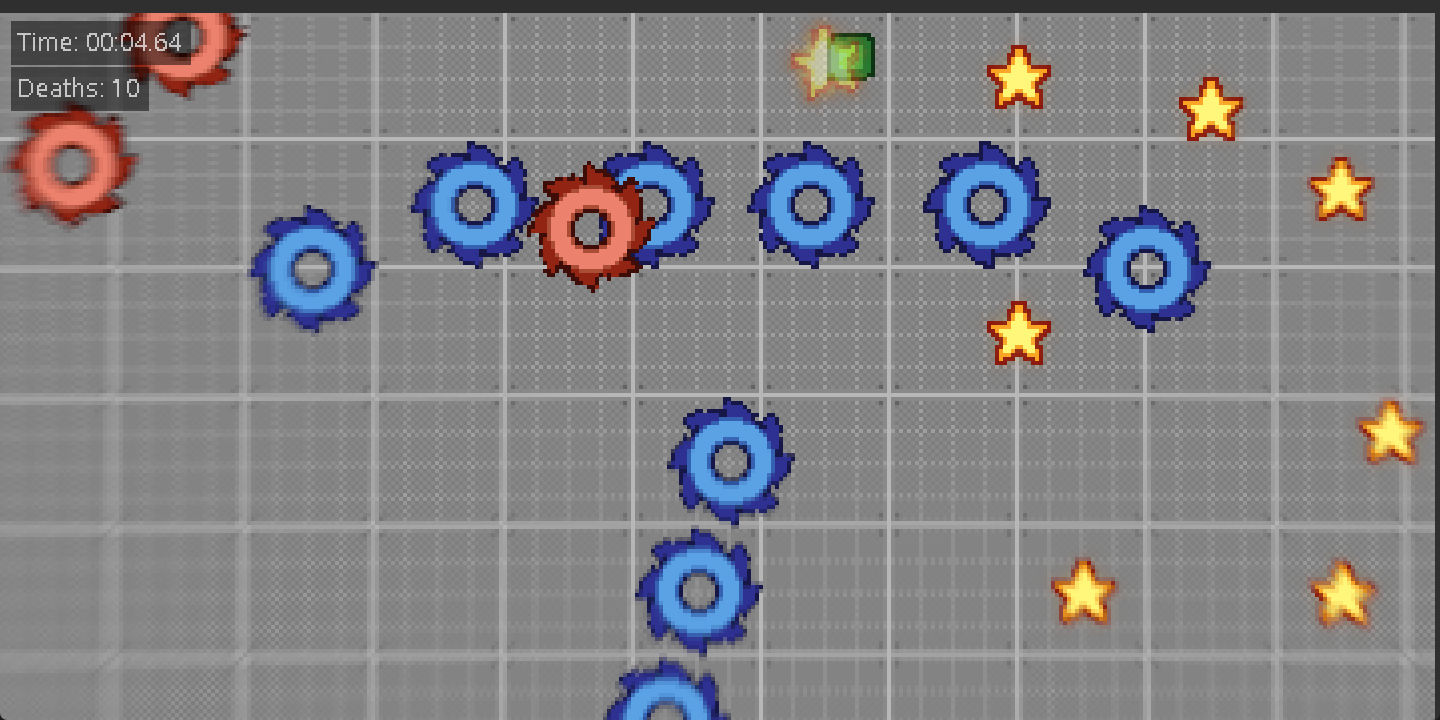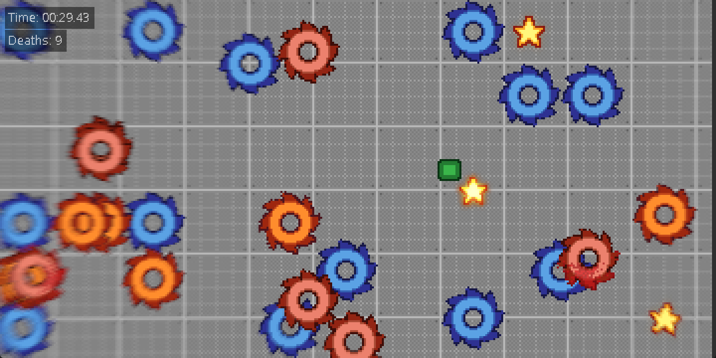 The goal here is to get every star while dodging the SAWS to go to the next stage. Don't worry tho. Dying to a SAW will only reset the current level you are at, so you can die as many as you want. But keep in mind the death counter will not stop counting, okay? Could you beat the game without dying?